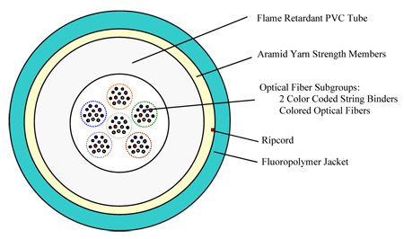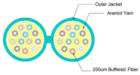 Diagrammed above is the cross section of the two cables. Each cable jacket has a diameter of 6.3mm, 72 optical fibers, aramid yarn, and an inner jacket. The assembly measures approximately 14.6mm including the “shotgun” overall jacket.